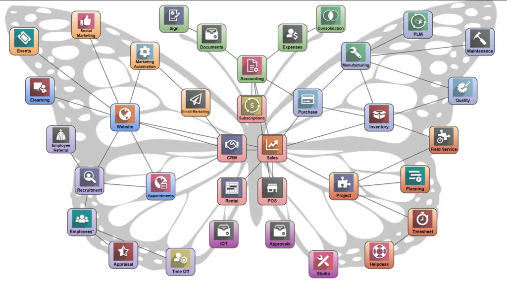 - Manufacturing: MRP, bill of materials, work orders, quality control, and machine planning